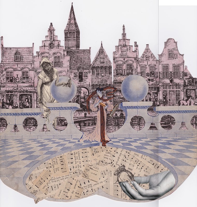 On A Bridge, hand cut collage, 11 x 10.5 inch (SOLD)