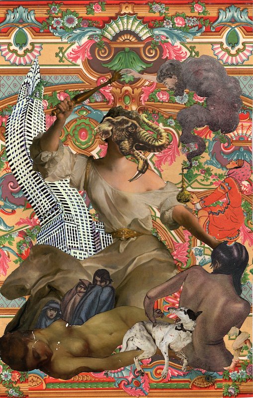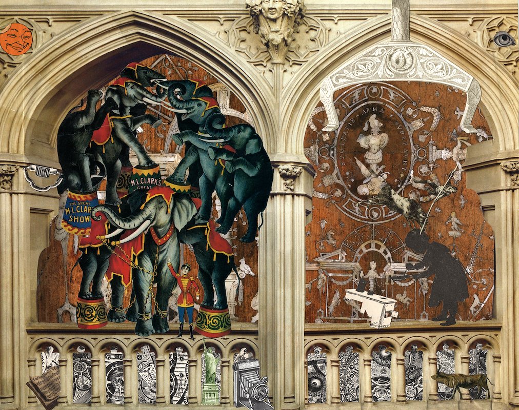 Washing the Elephant, hand cut collage, 7.5 x 6.5 inch (SOLD)