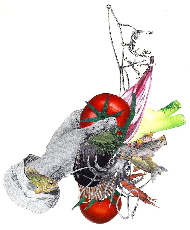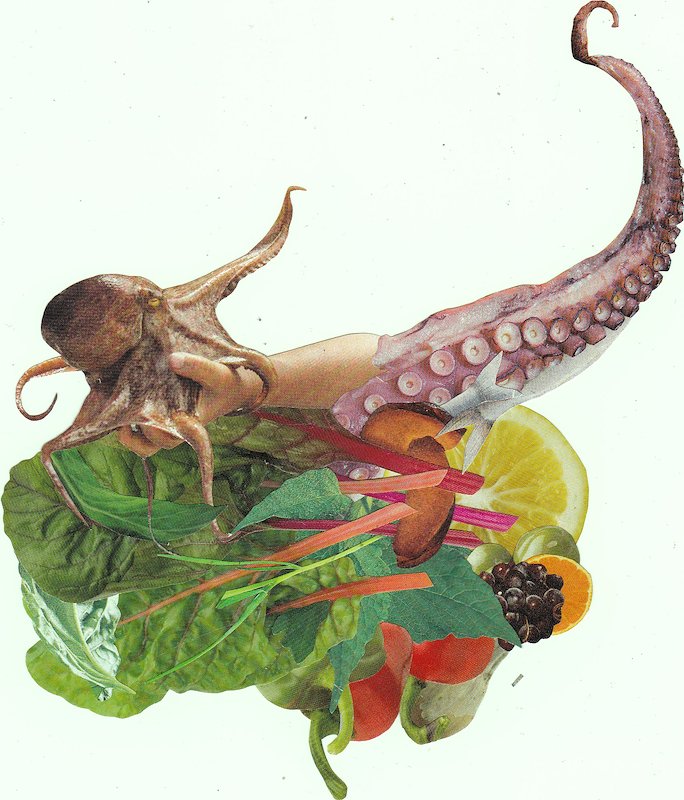 Squid Tomato, hand cut collage, 9 x 7 in, Venice-Italy