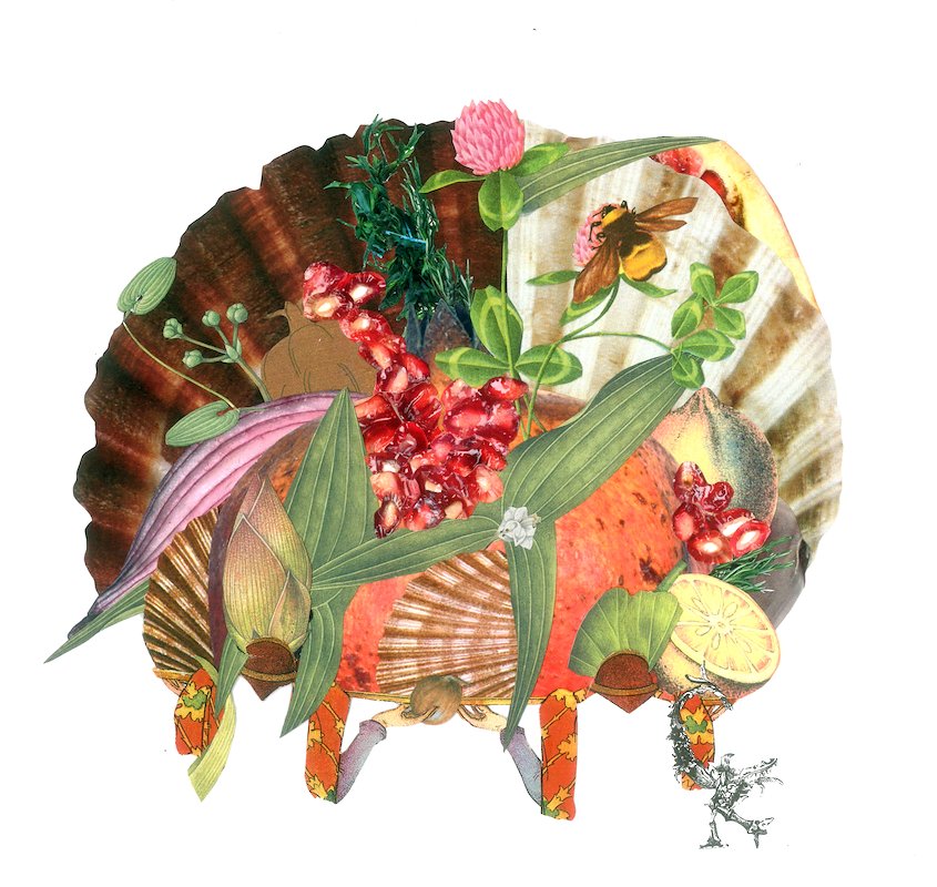 Scallop Pomegranate, hand cut collage, 8 x 8.5 in, Venice-Italy