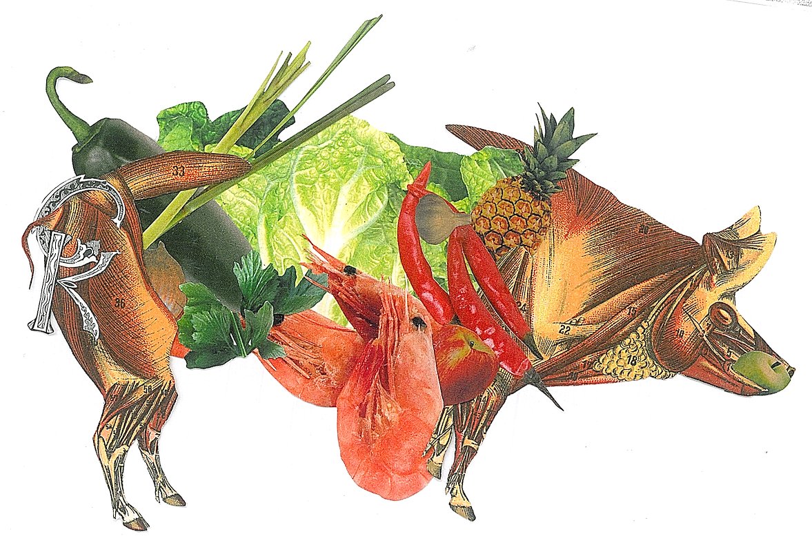 Porkshrimp, hand cut collage, 4 x 6.5 in, Brooklyn, NY